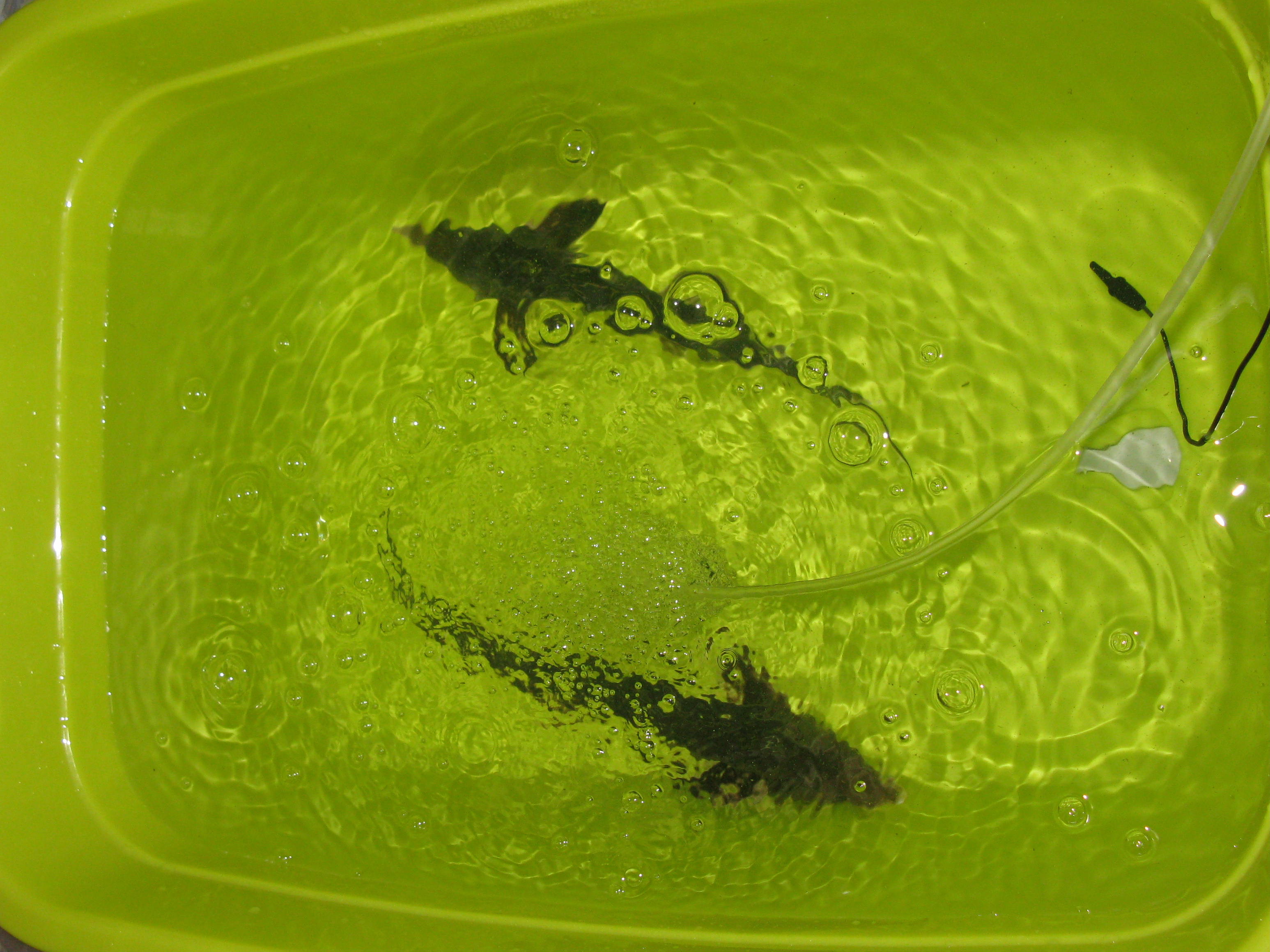 1時間ほど掛けて水合わせを行います。途中薄めのオキシドールにて薬浴も兼ねています。輸送中は粘膜等が痛み